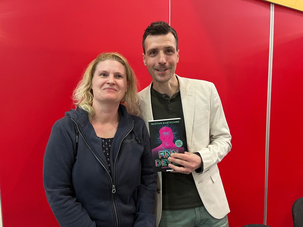 Ich hatte auf der Leipziger Buchmesse auch das Glück Bastian Martschink zu treffen, der das tolle Buch „Finn Dever: Letzter Blick“ geschrieben hat. Leider konnte oder wollte er meine Neugier für den zweiten Band nicht besänftigen. Vielen Dank für die Widmung und das nette Gespräch.