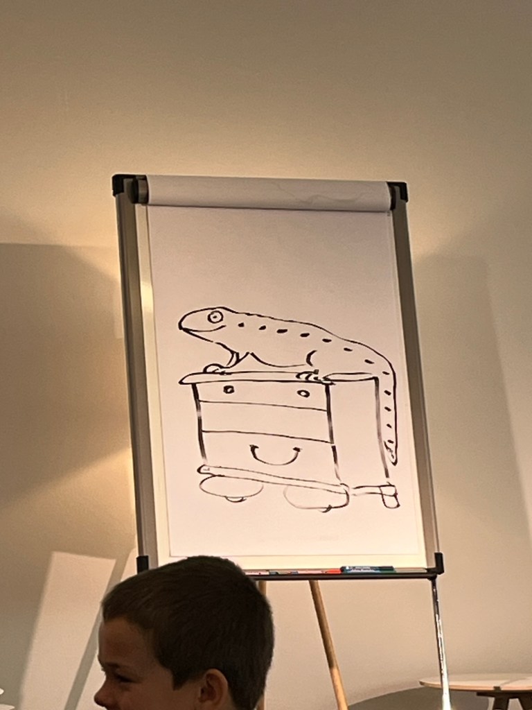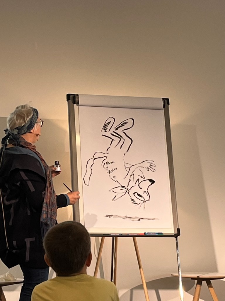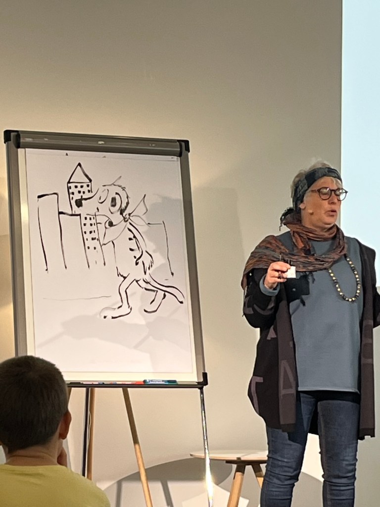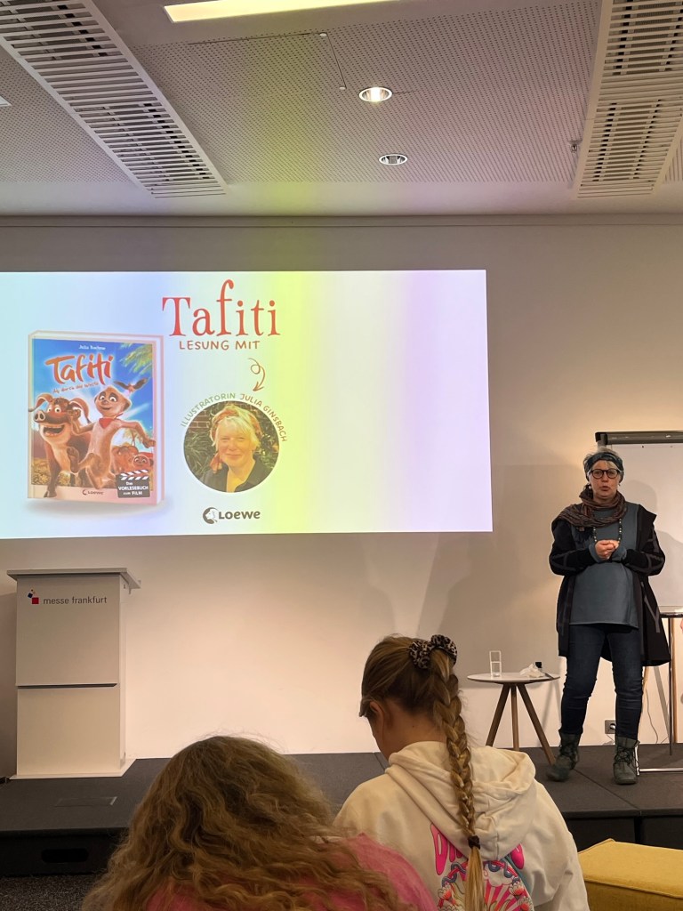 Eher zufällig landete ich bei der „Lesung“ zu dem schönen Kinderbuch Tafiti mit Julia Ginsbach. Es hätte eine Lesung werden sollen, doch die Autorin Julia Boehme war krank, sodass die Illustratorin Julie Ginsbach die Lesung übernommen hat und über die Entstehung des Buches berichtet hat und während der Erzählung auch immer wieder Bilder von Tafiti und seinen Freunden zeichnete.