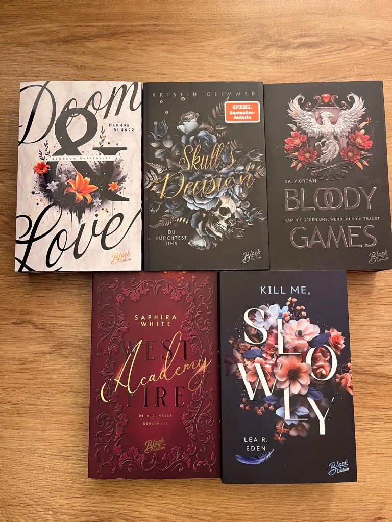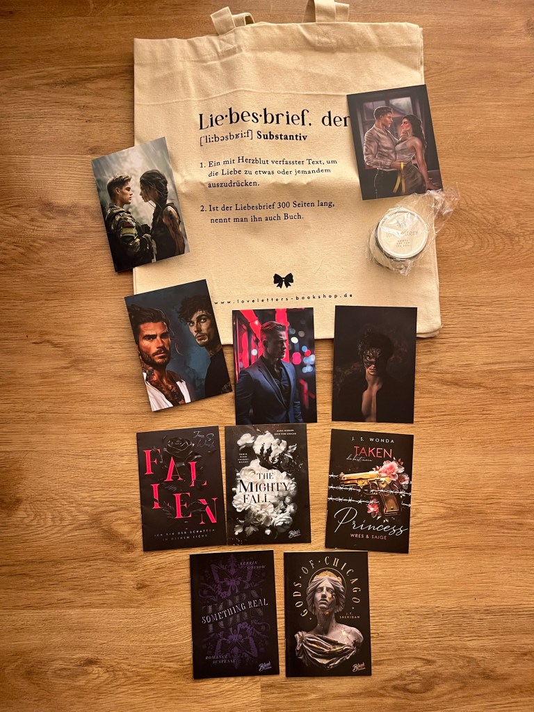Ich war schon richtig neugierig, was sich in meiner Box verbirgt, aber da ich so viel um die Ohren hatte während der Messe, habe ich es tatsächlich erst nach meiner Rückkehr geschafft, die Box zu öffenen und hätte mir vielleicht noch eine zweite Box gekauft, denn es findet sich kein einziges Buch in der Box, die auf meiner Wunschliste stehen, aber das soll ja nicht heißen, dass diese Bücher nicht toll sind. Sondern nur, dass ich sie bisher gar nicht auf dem Schirm hatte. Da es sich aber teilweise um Band 2 einer Reihe handelt, werde ich mich erstmal denen widmen, die Band 1 sind und dann überlegen, ob ich mir zu den anderen Band 1 kaufen werde.